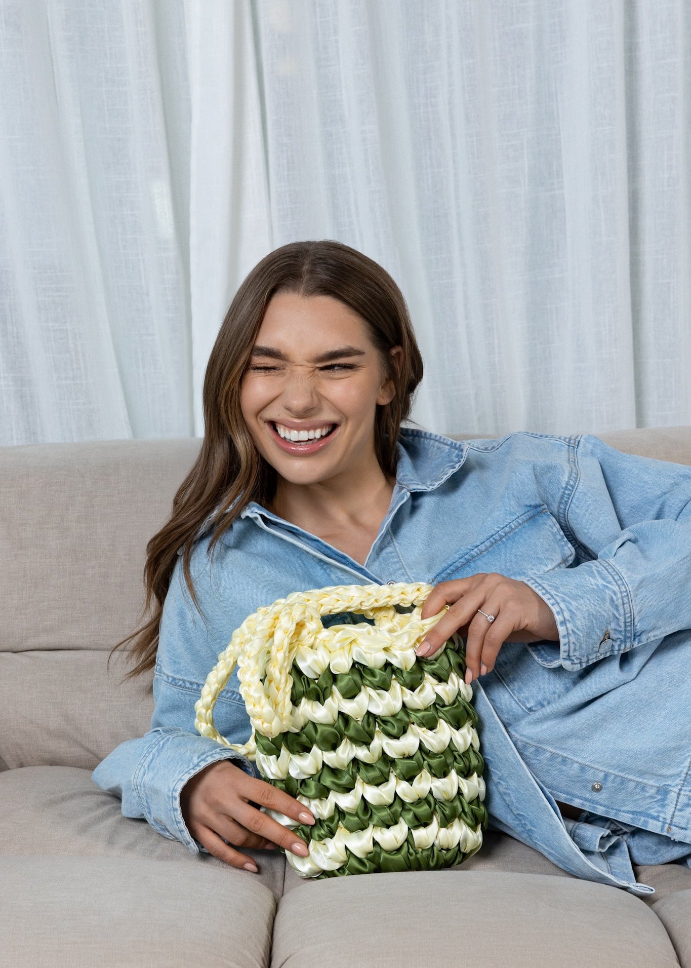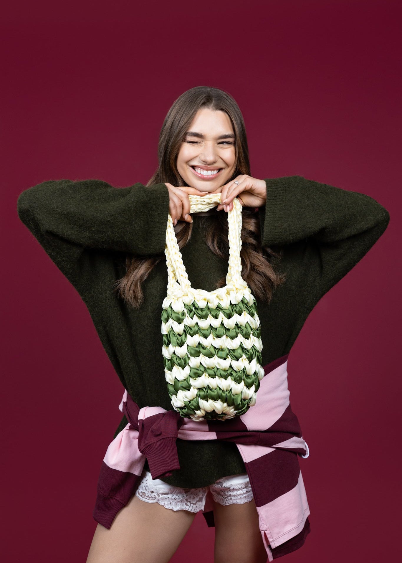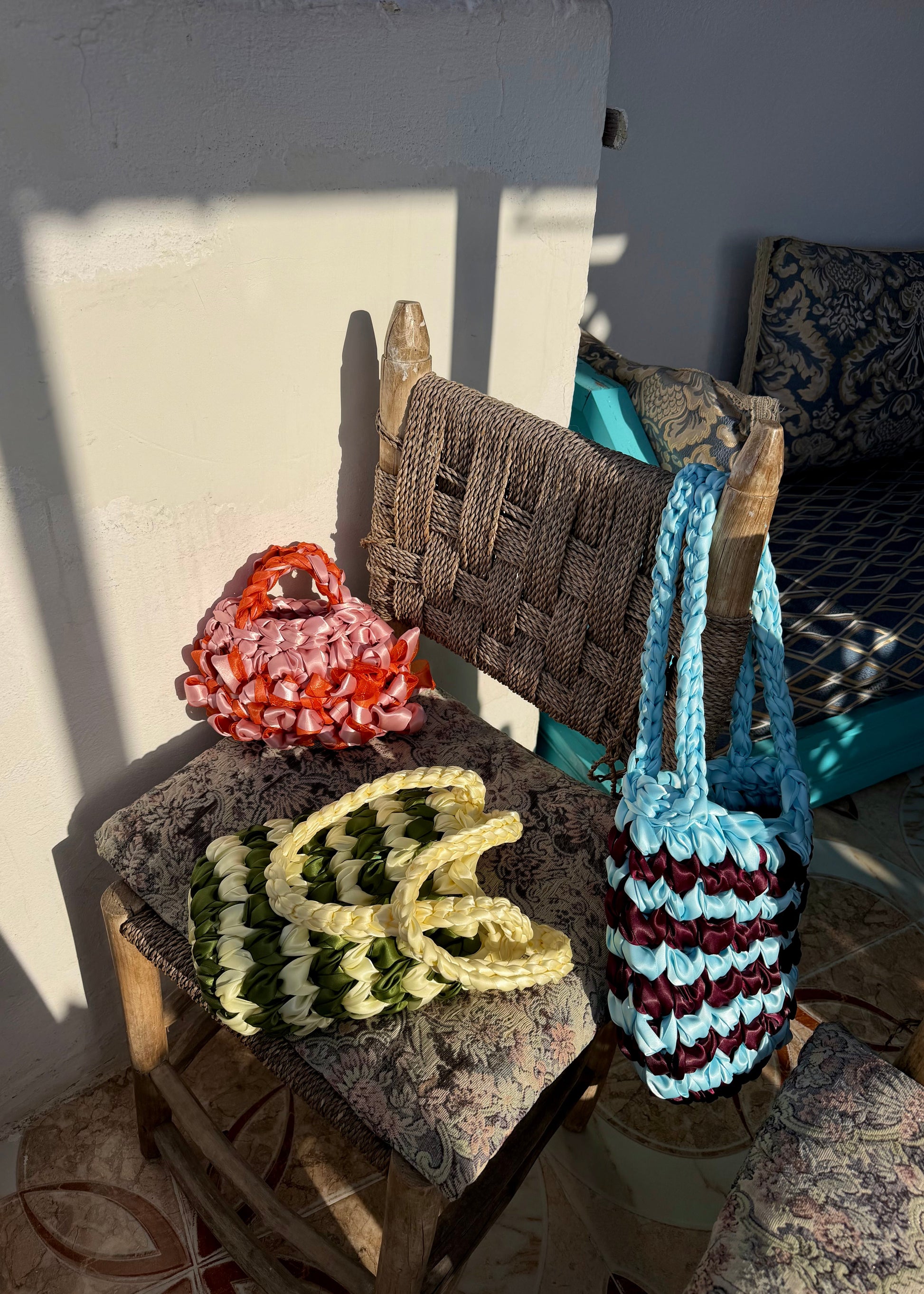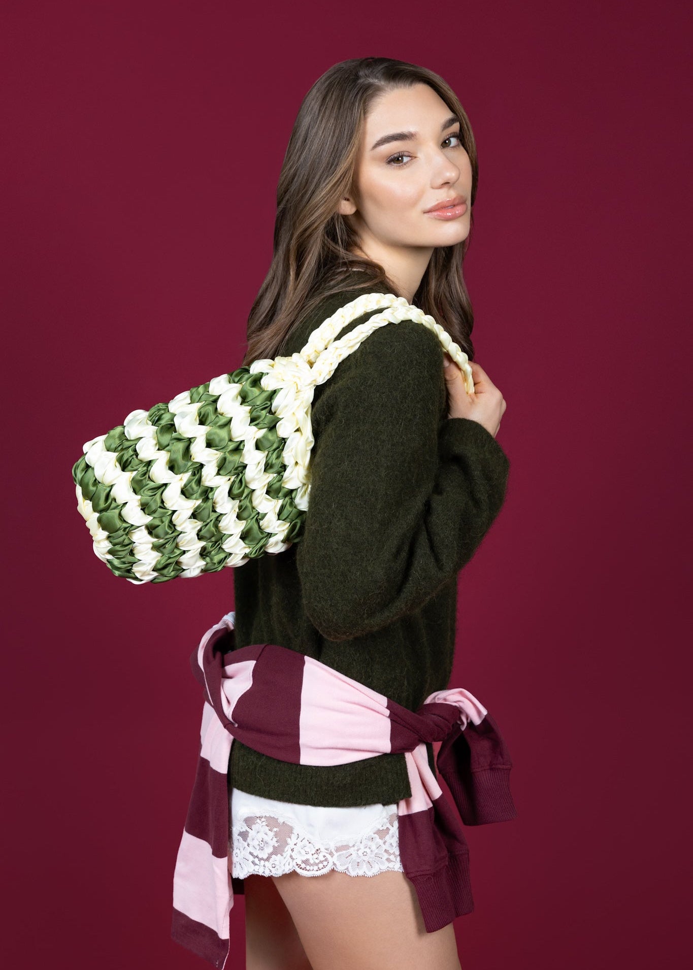 The NOTT Stripe in green and light yellow is handwoven from satin ribbon, creating a sculptural striped pattern that feels both fresh and nostalgic. The soft sheen catches the light, while the braided handles add texture and balance.